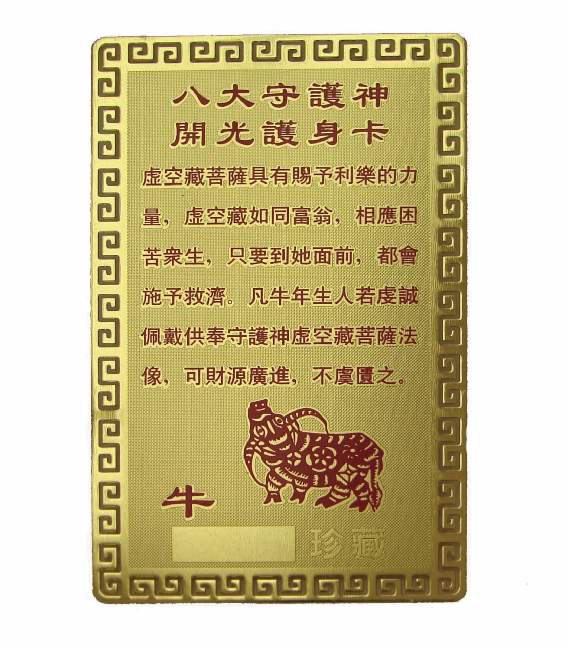 For Chinese Zodiac Ox person, carrying the Ox Horoscope Guardian Card Talisman (Akasagarbha talisman card) at all times will be benefit from your guardian deity. If you are not sure what zodiac sign you are, you can click the Zodiac Tool to find out.